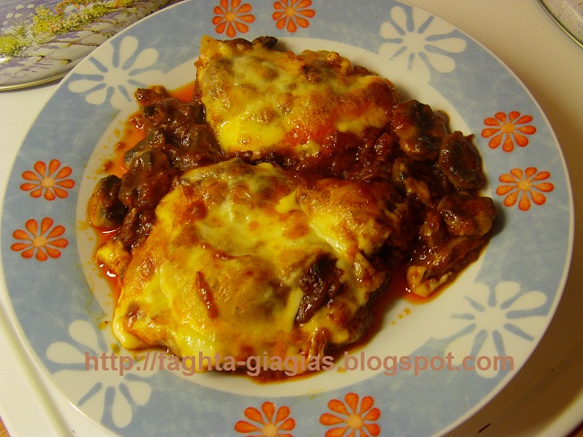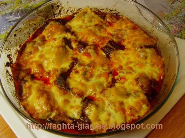 Αδειάζουμε το περιεχόμενο του τηγανιού σ’ ένα πυρέξ, ή στρογγυλό πήλινο και το φουρνίζουμε, σε προθερμασμένο φούρνο, στους 180°C, στις αντιστάσεις, για 30' περίπου.